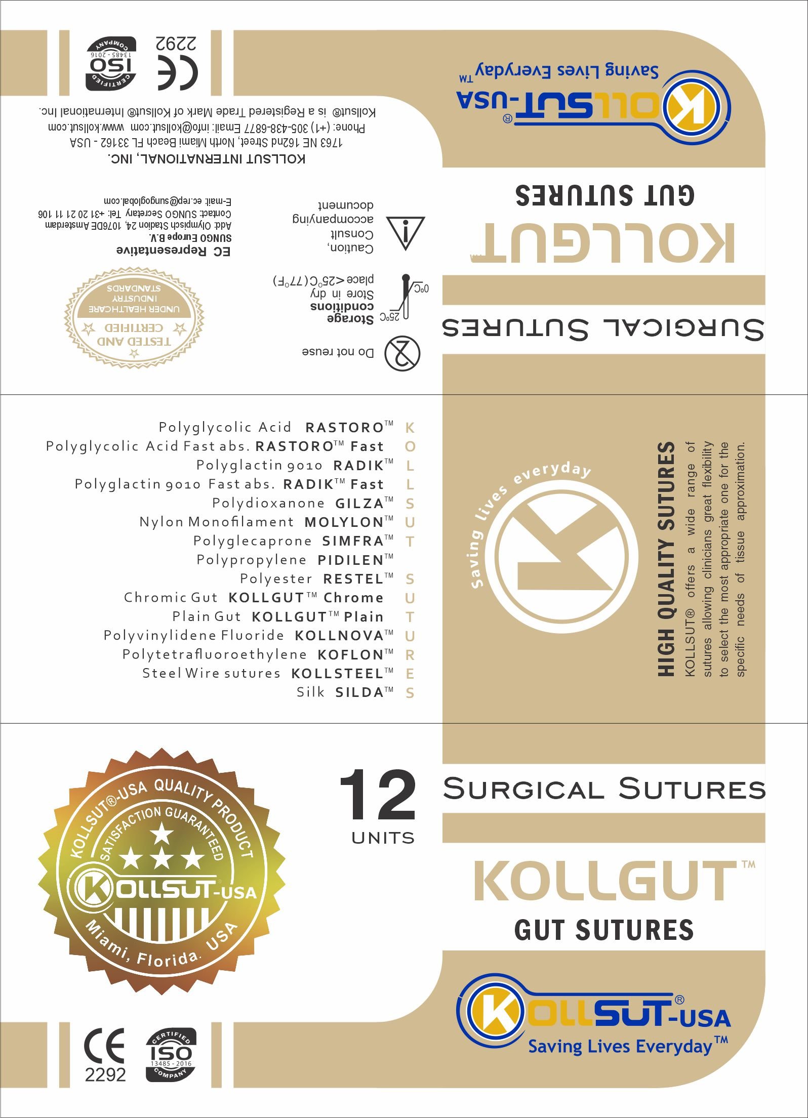 Kollgut™ Sutures (Chromic or Plain Catgut) Description: KOLLGUT™ (Chromic gut) is a collagen absorbable obtained from bovine animals and the serosa of the cows. Both are intestinal membrane. These are washed and sliced lengthwise into strips of variable width, classified according to the desired diameter, twisted, bathed in chromic salt*, dried and polished selected by diameter. *Chromic salt prolongs the time of absorption of the stitch in the body while the tissue heals. Type of thread: Multifilament twisted monofilament, with polished surface Reabsorption time: Absorption by enzyme. Strength Retention Profile about 21 - 28 days after implantation. Predictable absorption (loss of mass) in 90 days. Benefits of the Suture: Easy passage through tissue Thread color: Kollgut™ sutures are Dark brown color Available thread sizes: USP 8/0 to 4 / Metric 0.4 to 6 Available length: From 150, 120, 100, 90, 80, 75, 70, 60, 50, 45 and 30 cm, with one or two or without needle, from one thread to 10 threads above. Type of final presentation: The envelopes containing the sutures are packaged in a duly identified and protected with a cardboard box laminating plastic thermocontractable. The quantity can be: 12, 24 or 36 envelopes in each box. Type of sterilization: Kollgut™ Chrom sutures are sterilized through a process of (Co-60) gamma irradiation. Expiration Date: Kollgut™ Chrom sutures have an expiry date of 5 years from manufacture. Color of identification: Kollgut™ Chrom Sutures are identified by the brown color on the box label.